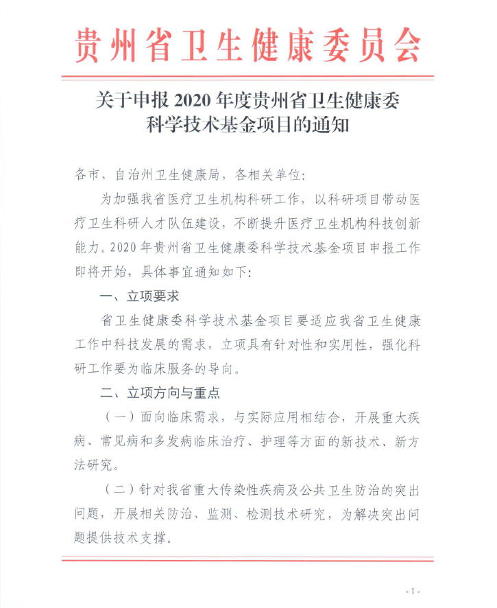 現接到貴州省衛健委《關于申報2020年度貴州省衛生健康委科(kē)學(xué)技(jì )術基金項目的通知》,2020年度貴州省衛健委科(kē)學(xué)技(jì )術基金項目将于4月20日至5月20日進行網上申報,現将相關内容通知如下,請各科(kē)室積極組織申報。